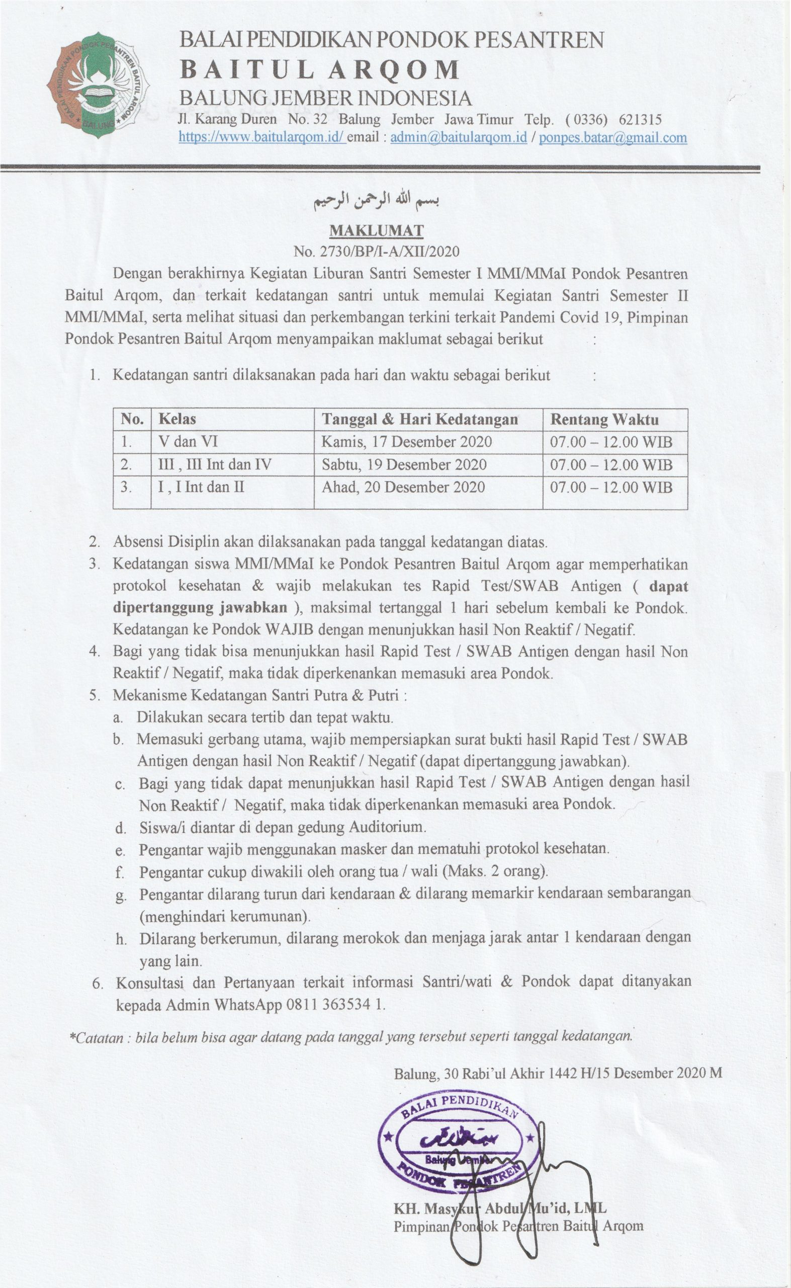 Dengan berakhirnya Kegiatan Liburan Santri Semester I MMI/MMaI Pondok Pesantren Baitul Arqom, dan terkait kedatangan santri untuk memulai Kegiatan Santri Semester II MMI/MMaI, serta melihat situasi dan perkembangan terkini terkait Pandemi Covid 19, Pimpinan Pondok Pesantren Baitul Arqom menyampaikan maklumat sebagai berikut       :